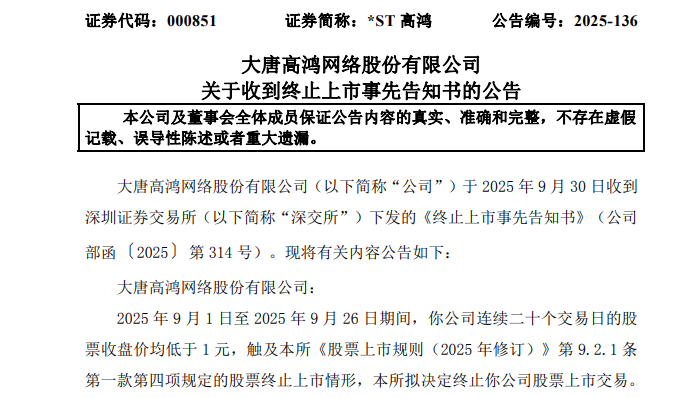 *ST高鸿(000851)(000851)10月8日公告,公司于9月30日收到深圳证券交易所下发的《终止上市事先告知书》,因公司股票在2025年9月1日至9月26日期间连续二十个交易日的收盘价均低于1元,触及股票终止上市情形。公司有权在收到告知书之日起五个交易日内申请听证,或在十个交易日内提交书面陈述和申辩。截至前一交易日,公司股价仅剩0.38元。